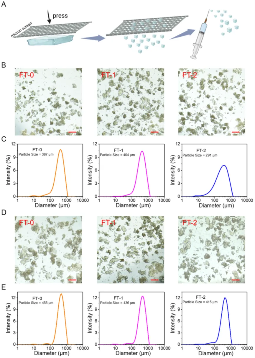 圖4 (A)制備打印RSF水凝膠微粒示意圖。(B)孔徑為150 μm的篩網(wǎng)打印的FT-0、FT-1和FT-2微粒的顯微鏡圖像。比例尺= 200 μm。(C)孔徑為150 μm的篩網(wǎng)打印的FT-0、FT-1和FT-2微粒的粒徑分布曲線。(D) 26號針注射后FT-0、FT-1和FT-2微粒的顯微鏡圖像。比例尺= 200 μm。(E) 26號針注射后FT-0、FT-1和FT-2微粒的粒徑分布曲線。