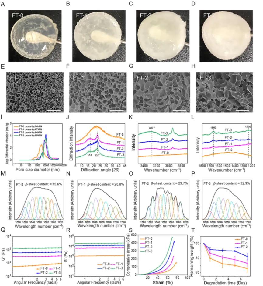 圖2A-D所示,制備的4種不同凍融周期的RSF水凝膠的透明度與循環(huán)次數(shù)成反比。SEM圖像(圖2E-H)顯示,所有水凝膠都具有均勻且相互連接的多孔結(jié)構(gòu)。采用壓汞法定量測定了RSF水凝膠的孔隙度和孔徑分布。從圖2I可以看出,經(jīng)過凍融處理的RSF水凝膠的平均孔徑大于FT-0水凝膠的平均孔徑,與SEM結(jié)果一致。4種不同凍融孔隙率差異不大,說明凍融對RSF水凝膠孔隙率無明顯影響。通過XRD分析對RSF水凝膠的晶體結(jié)構(gòu)進行評價(圖2J)。FT-0在20°左右出現(xiàn)一個加寬的峰,表明β-片的含量較低。相比之下,經(jīng)過凍融處理的RSF水凝膠的XRD有很大不同。這些水凝膠分別在16.7°和22.8°處有2個衍射峰。圖2K采用拉曼光譜對樣品進行表征,結(jié)果顯示,F(xiàn)T-1、FT-2和FT-3的β-折疊對應(yīng)的峰位于1663 cm-1和1236 cm-1。如圖2M-P所示,當凍融循環(huán)次數(shù)從0次增加到3次時,水凝膠中β-折疊結(jié)構(gòu)的含量從15.6%增加到32.9%,這證實了RSF水凝膠中β-折疊的含量可以通過凍融方法進行調(diào)節(jié)。圖2Q和圖R所示,所有RSF水凝膠均呈現(xiàn)穩(wěn)定的水凝膠狀態(tài),且在測試范圍內(nèi),存儲模量(G′)始終大于損耗模量(G″)。