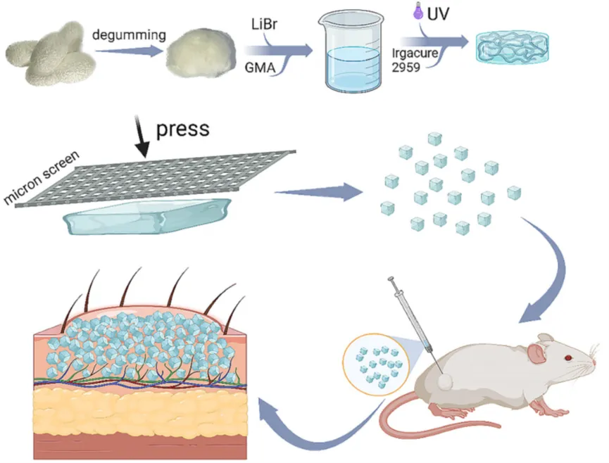 圖1 RSF水凝膠微粒的制備及其作為注射填料的應(yīng)用示意圖。