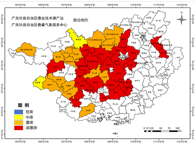 2.進入9月上旬,廣西各主蠶區(qū)以高溫晴熱天氣為主,最高溫度在34℃-35℃,各地宜做好蠶房通風降溫工作。