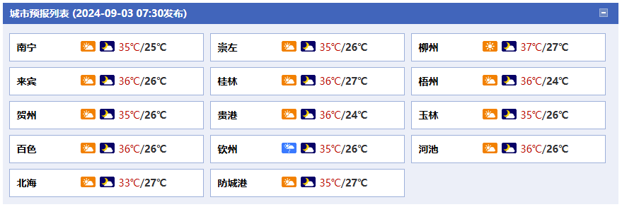 今天白天,欽州、防城港、崇左、百色、河池、桂林、賀州、梧州、貴港、玉林等市多云有分散陣雨或雷雨、局地大雨,其它地區(qū)多云到晴。最高氣溫:全區(qū)大部35~36℃、局地37℃以上。