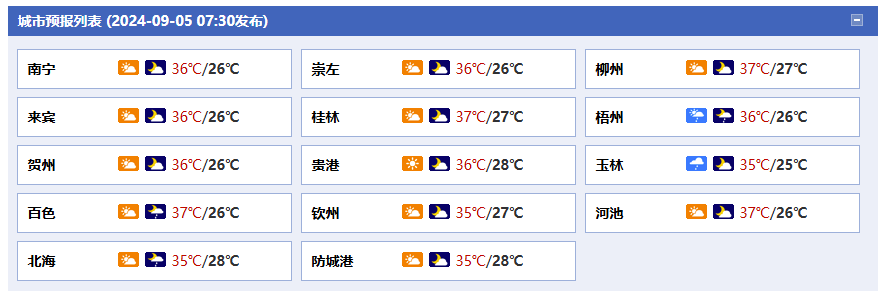 南寧市:今天白天到晚上,多云到晴、局地有雷陣雨,東北風1~2級,最高氣溫36℃,最低氣溫26℃.