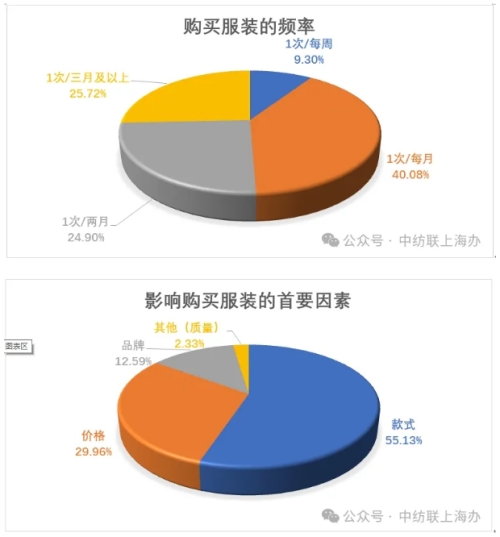 大多數(shù)人購買服裝的頻率是一到三個月消費(fèi)一次。在受訪者中,每月消費(fèi)一次的人群比例占到40.08%,每二個月消費(fèi)一次的比例占到24.90%,每三個月消費(fèi)一次的比例占到25.72%。對于影響消費(fèi)者購買服裝的首要因素,大多數(shù)人選擇了款式,這一比例占到55.13%,其次是價格,這一比例占到29.96%。