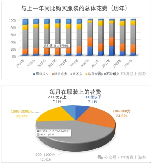 受訪的消費(fèi)者中有31.46%的人表示在服裝上的總體消費(fèi)是減少了的,僅有14.36%的受訪者表示消費(fèi)在增加,另有54.17%的受訪者表示在服裝上的消費(fèi)和去年是差不多的。對于每個月用在服裝上的花費(fèi),大多數(shù)受訪者選擇了在300-1000元之間,這一比例占到42.41%,其次是100-300元之間,這一比例是24.62%。從近幾年的調(diào)查數(shù)據(jù)來看,大家在消費(fèi)能力上的變化并不是太大,但是疫情對消費(fèi)的信心是有較大影響的,特別是在今年,這種影響逐漸顯現(xiàn)。從調(diào)查數(shù)據(jù)看,大家對經(jīng)濟(jì)走勢持悲觀或很悲觀觀點(diǎn)的人的占比為33.24%,比去年的調(diào)查數(shù)據(jù)增加了3.62個百分點(diǎn),持樂觀和很樂觀觀點(diǎn)的人的占比為36.66%,比去年的調(diào)查數(shù)據(jù)減少了4.2個百分點(diǎn)。對于后續(xù)在服裝上的消費(fèi)預(yù)算,有25.17%的受訪者表示會減少,這一數(shù)據(jù)與去年基本持平,僅有9.17%的受訪者表示會增加,這一數(shù)據(jù)比去年減少了2.36個百分點(diǎn)。