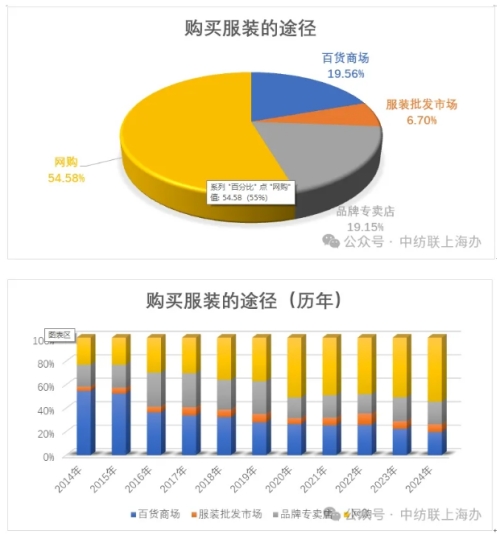 有54.58%的受訪者表示主要是通過網(wǎng)購來購買服裝,這一比例比去年調(diào)查時又增加了3.85個百分點(diǎn)。隨著年歲的增長,伴隨著互聯(lián)網(wǎng)成長起來的一代人已經(jīng)成為消費(fèi)的主力軍,網(wǎng)購的便利性已經(jīng)使其滲入到各個消費(fèi)領(lǐng)域。在我們歷年對服裝消費(fèi)的調(diào)查中,網(wǎng)購的比例從10年前的23.11%到現(xiàn)在已經(jīng)增長了31.47個百分點(diǎn)。而同時,去百貨公司購買服裝的比例則從10年前的54.58%下降到了現(xiàn)在的19.56%,下降了35.02個百分點(diǎn)。這說明,10年來人們在服裝的消費(fèi)渠道上發(fā)生了根本的改變,百貨公司已經(jīng)不適應(yīng)人們的消費(fèi)習(xí)慣,這也印證了我們對商場的調(diào)查中客流量連年下降的現(xiàn)象。但在這十年中,去品牌專賣店購買服裝的比例卻是相對穩(wěn)定的,一直維持在20%左右,今年的比例是19.15%。這說明對于高端的服裝消費(fèi)來說,還是注重于消費(fèi)體驗(yàn),而且習(xí)慣于這種消費(fèi)的人群相對穩(wěn)定。