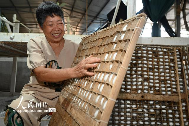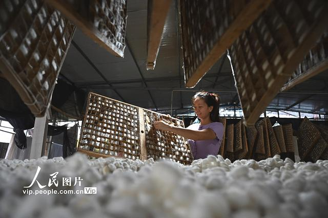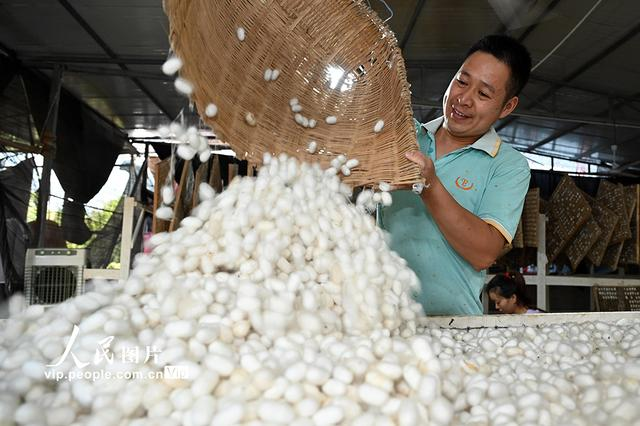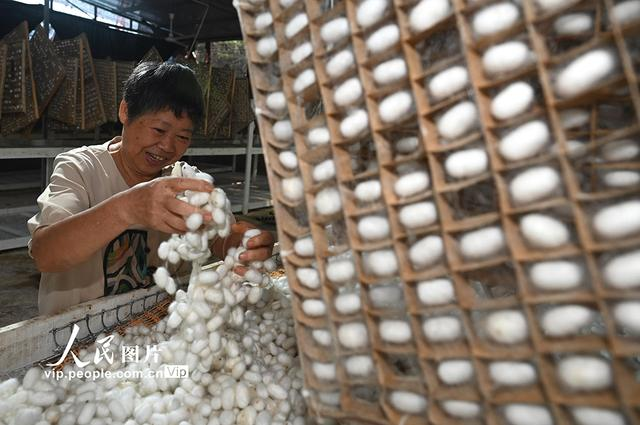 2024年9月5日,四川省內(nèi)江市東興區(qū)雙橋鎮(zhèn)雙流村,蠶農(nóng)在收獲秋繭。