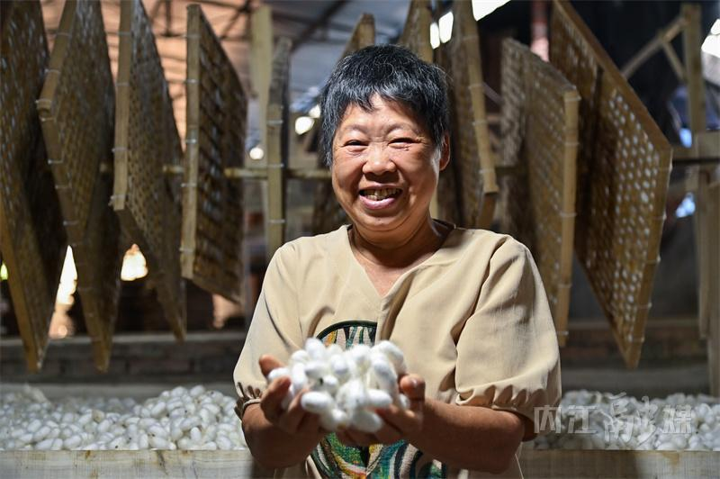 9月5日,內(nèi)江市東興區(qū)雙橋鎮(zhèn)雙流村,東興區(qū)鑫絲路養(yǎng)殖專業(yè)合作社,蠶農(nóng)手捧蠶繭綻放笑容