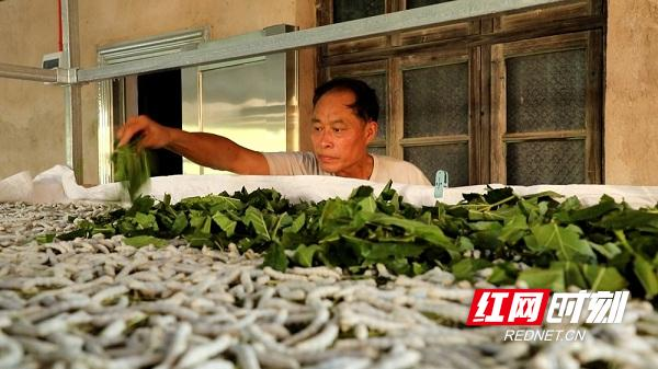 “投入成本和收入大概是1比10 。打個(gè)比方,你投入1塊錢的養(yǎng)殖成本,大概能賣回10塊錢收入?!币皇痔嶂窕@,一手給大蠶均勻投喂桑葉的肖承權(quán)介紹說,這是他養(yǎng)殖的第七批蠶,即將吐絲結(jié)繭,企業(yè)上門收購蠶繭后,便可養(yǎng)殖下一批蠶。