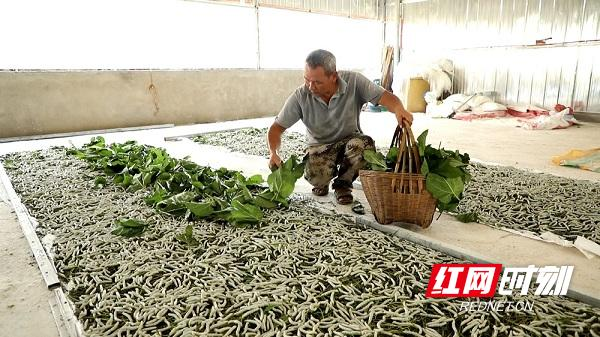 種桑養(yǎng)蠶大戶肖承權(quán)在蠶室里給大蠶投喂桑葉