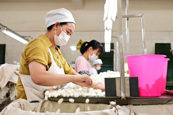 寧南縣繭絲綢工業(yè)集中發(fā)展區(qū)南絲路集團生產(chǎn)車間內(nèi)工人正在忙碌