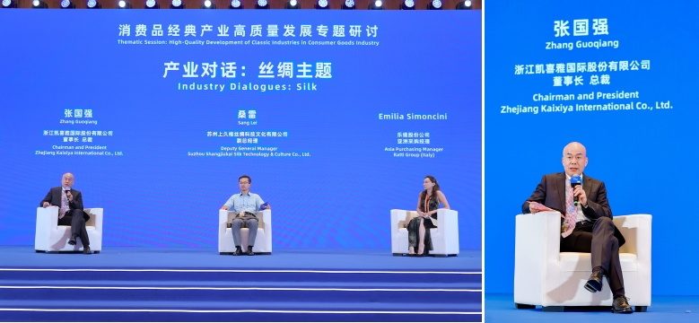 “產(chǎn)業(yè)對話:絲綢主題”環(huán)節(jié),集團(tuán)董事長張國強(qiáng)表示,絲綢作為浙江省歷史經(jīng)典產(chǎn)業(yè),在國家的扶持和省委省政府的大力支持下,凱喜雅作為中國真絲綢商品出口的龍頭企業(yè),持續(xù)強(qiáng)化科技創(chuàng)新力度,優(yōu)化健全人才集聚機(jī)制,深入推進(jìn)產(chǎn)業(yè)迭代升級,通過新質(zhì)生產(chǎn)力引領(lǐng)絲綢產(chǎn)業(yè)高質(zhì)量發(fā)展。凱喜雅始終堅(jiān)持深耕并持續(xù)優(yōu)化涵蓋種桑養(yǎng)蠶、繅絲織造、印染及后整理、服裝服飾制造加工和自有品牌建設(shè)的絲綢大紡織全產(chǎn)業(yè)鏈,切實(shí)踐行以桑蠶絲為核心、打造“絲質(zhì)”高端面料研發(fā)創(chuàng)新體系的戰(zhàn)略舉措,同時(shí),開拓性布局蠶桑生物科技產(chǎn)業(yè)鏈,在國內(nèi)外廣泛布局產(chǎn)業(yè)鏈供應(yīng)鏈價(jià)值鏈體系。凱喜雅作為國際絲綢聯(lián)盟發(fā)起單位、主席單位,充分發(fā)揮并擔(dān)當(dāng)起全球絲綢行業(yè)最具影響力的專業(yè)化、國際化交流合作平臺的作用和責(zé)任,積極構(gòu)筑全球絲綢行業(yè)橋梁,加深全球絲綢行業(yè)的內(nèi)在聯(lián)系與合作紐帶,持續(xù)推動絲綢產(chǎn)業(yè)與大紡織領(lǐng)域的跨界融合,探索創(chuàng)新應(yīng)用的新路徑,為絲綢行業(yè)的多元化發(fā)展與全球影響力拓展貢獻(xiàn)卓越力量。