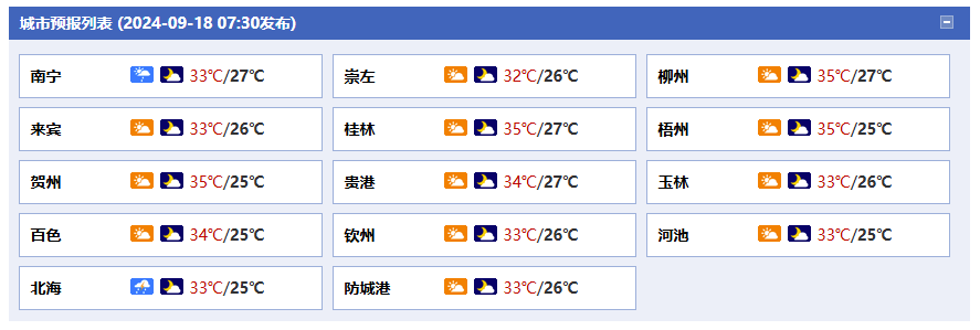 南寧市:今天白天多云有陣雨或雷雨,今天晚上多云,東北風(fēng)1~2級,最高氣溫34℃,最低氣溫27℃。