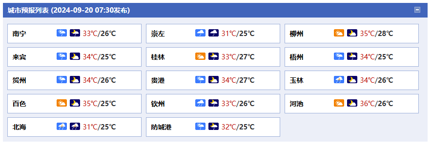 南寧市:今天白天到晚上,多云有陣雨或雷雨,東北風2級,最高氣溫33℃,最低氣溫26℃。