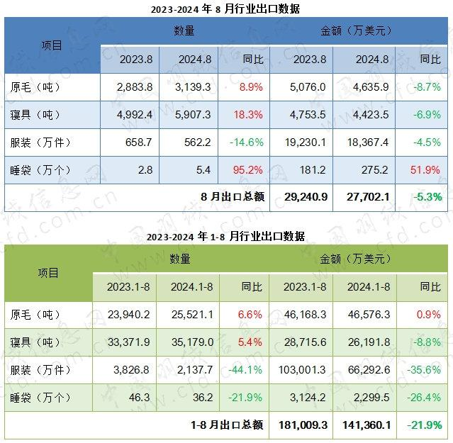 2024年8月,行業(yè)出口總額約2.8億美元,同比下降5.3%,較上月降幅繼續(xù)縮窄約6.7個(gè)百分點(diǎn)。原毛和寢具出口量繼續(xù)保持增長(zhǎng),其中原毛出口量3139.3噸,同比增長(zhǎng)8.9%,出口額4,635.9萬(wàn)美元,同比下滑8.7%;寢具出口量5,907.3噸,同比增長(zhǎng)18.3%,出口額4,423.5萬(wàn)美元,同比下滑6.9%。服裝出口繼續(xù)下跌,出口量同比去年8月從658.7萬(wàn)件減至562.2萬(wàn)件,降幅14.6%,出口額同比下降4.5%。