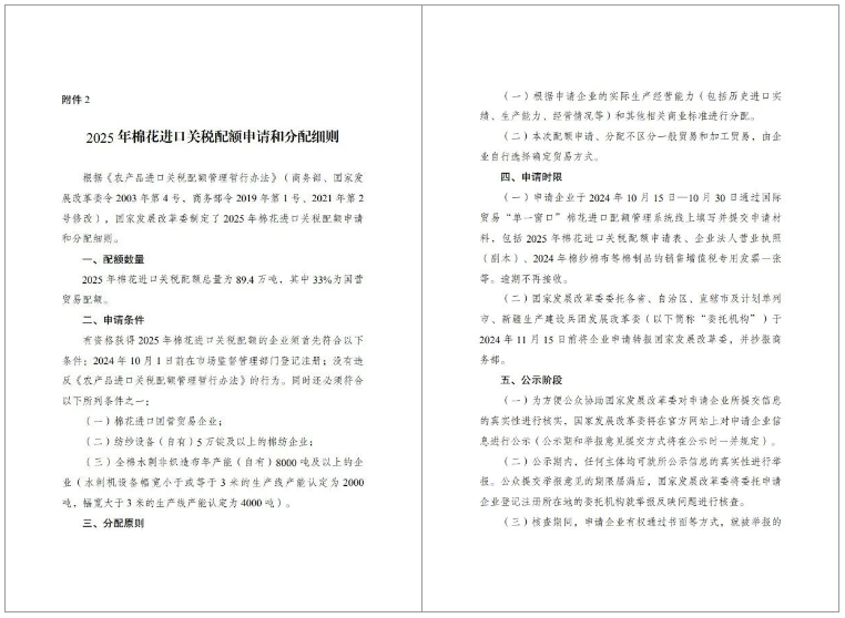 根據(jù)《農(nóng)產(chǎn)品進口關(guān)稅配額管理暫行辦法》及相關(guān)修訂,2025年棉花進口關(guān)稅配額總量確定為89.4萬噸,其中33%為國營貿(mào)易配額。此舉旨在調(diào)控國內(nèi)外棉花市場,保障國內(nèi)棉花產(chǎn)業(yè)的穩(wěn)定發(fā)展。