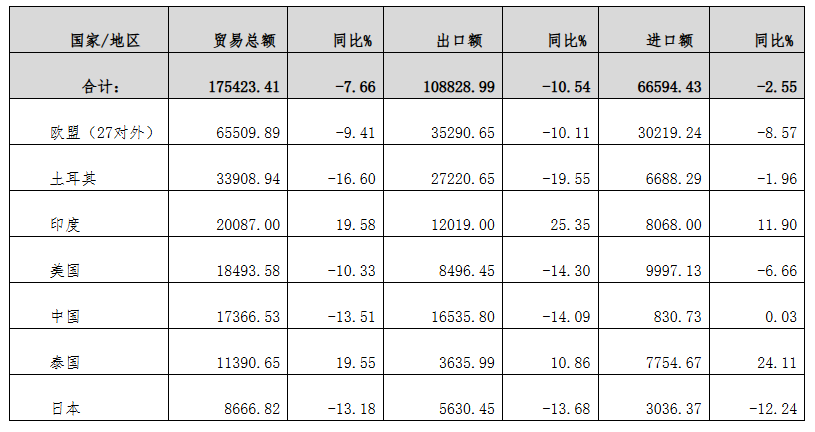 其中,印度、泰國貿易額分別增長19.58%和19.55%,其余4國和歐盟的貿易額呈現(xiàn)不同程度的下降。