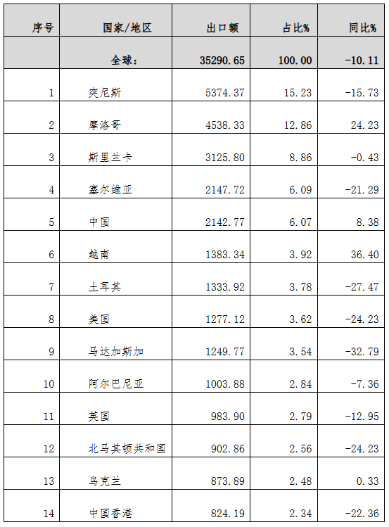 在主要市場中,對俄羅斯、摩洛哥和烏克蘭出口有增長,對其他主要市場出口均下降。