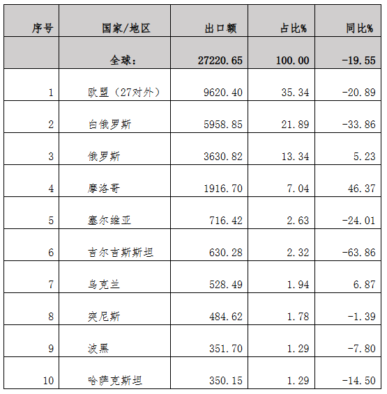 土對歐盟、白俄羅斯和俄羅斯出口額近2億美元,合計占比超70%。雖對前兩大主要市場出口下滑較大,但對第三、四大市場俄羅斯、摩洛哥出口分別增長了5.23%和46.37%(詳見表3)。