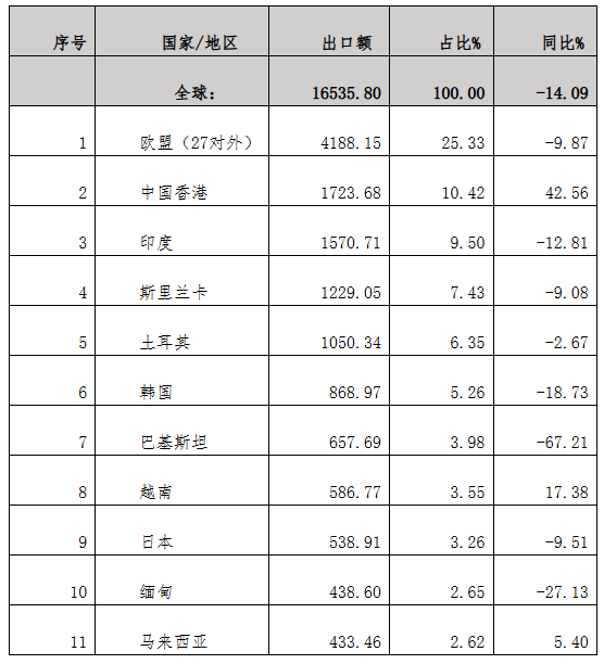 與其他主要供應者相比,歐盟綢緞出口市場相對分散,前5位主要市場合計占比49.10%。