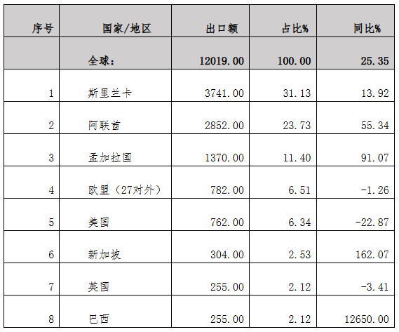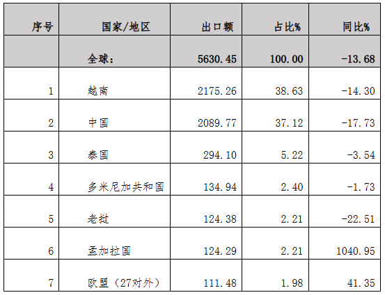 在主要市場中,除對柬埔寨出口下降外,對其他市場出口均增長(詳見表8)。