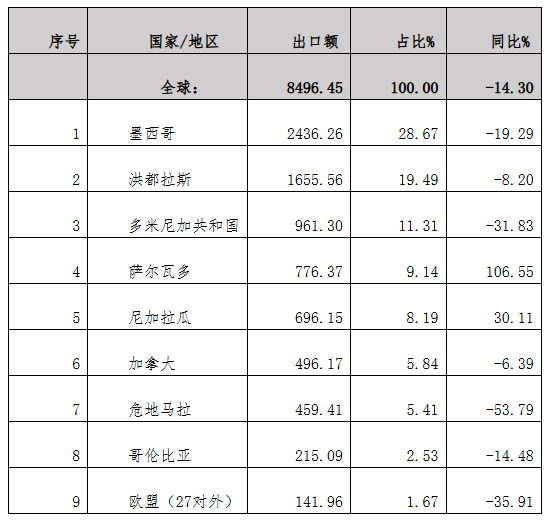 美對絕大部分主要市場出口都下降,但對薩爾瓦多、尼加拉瓜出口卻出現(xiàn)了106.55%和30.11%的增長(詳見表6)。