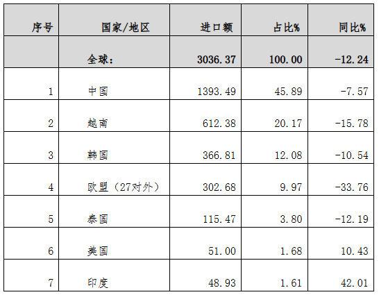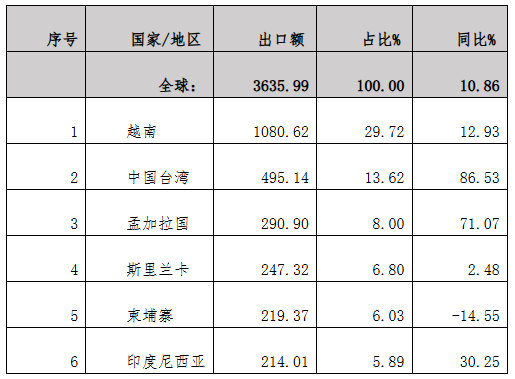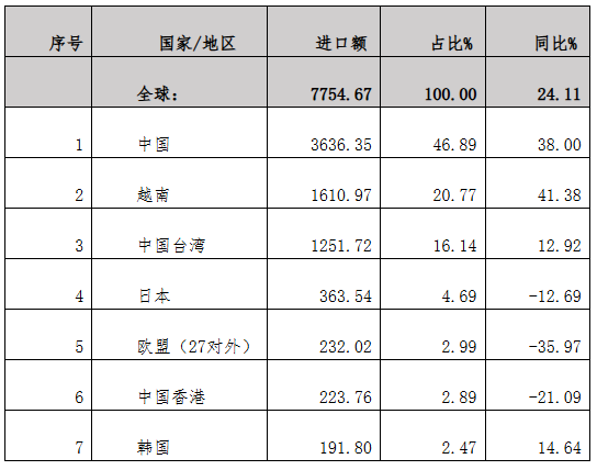 自主要來源地中國、越南和中國臺灣進口額合計6499.03萬美元,占比達83.81%。自中國、越南和中國臺灣地區(qū)進口增幅較大,而自日本、中國香港和韓國進口均有較大降幅(詳見表12)。
