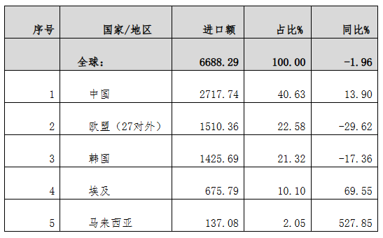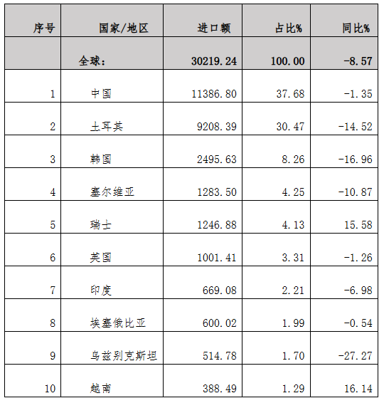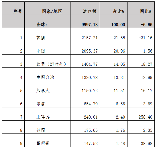 自前5個主要來源地進口額占比均超過10%,合計占比達81.31%。從韓國、歐盟進口下滑明顯,但從中國、中國臺灣地區(qū)和加拿大的進口均有所增長(詳見表10)。