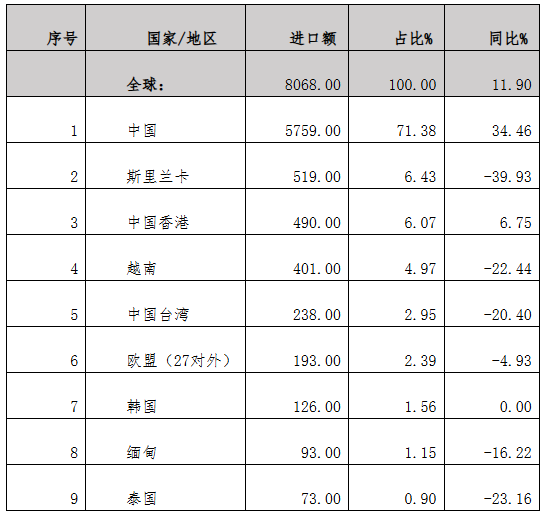 在主要來源地中,自中國進口占比為71.38%,進口額大增34.46%。自其他國家(地區(qū))進口額仍很小(詳見表11)。