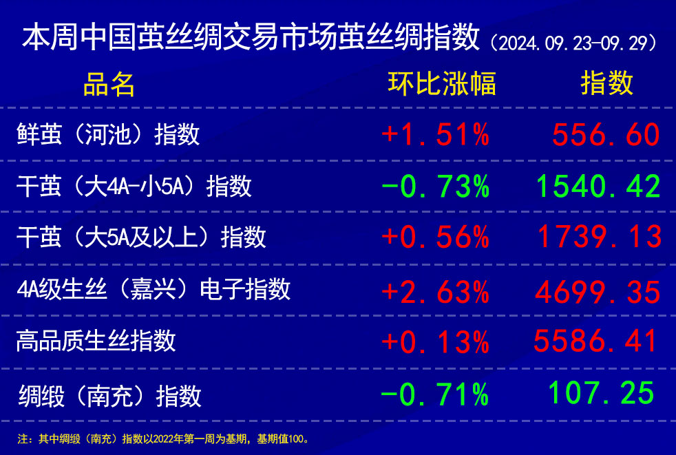 本周,主要在政策面多種利好帶動(dòng)下,本周證券市場(chǎng)和大宗商品市場(chǎng)整體上漲,生絲電子指數(shù)累計(jì)上漲2.63%。