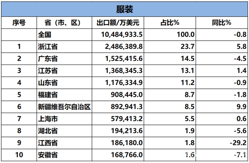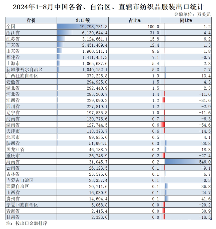 2024年1-8月我國(guó)紡織服裝重點(diǎn)省市出口概況