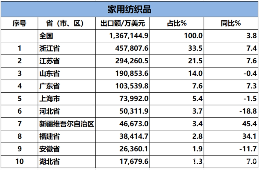 2024年1-8月紡織服裝類重點(diǎn)商品出口前十名的省(市、區(qū))