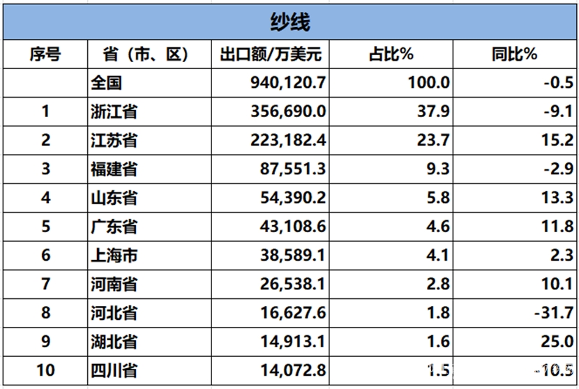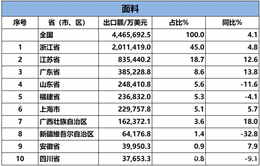 2024年1-8月,我國(guó)紡織服裝累計(jì)出口1979.87億美元,同比增長(zhǎng)1.2%。內(nèi)地31個(gè)省、自治區(qū)、直轄市紡織服裝統(tǒng)計(jì)數(shù)據(jù)已出爐,浙江省、江蘇省、廣東省、山東省、福建省分別列全國(guó)紡織服裝出口省市前五位,合計(jì)比重超七成。