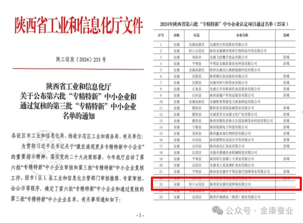 近日,陜西省工信廳印發(fā)《關(guān)于公布第六批“專精特新”中小企業(yè)和通過(guò)復(fù)核的第三批“專精特新”中小企業(yè)名單的通知》,經(jīng)審核推薦、專家評(píng)審和社會(huì)公示等程序,安康市蠶種場(chǎng)有限公司被認(rèn)定為2024年陜西省第六批“專精特新”中小企業(yè)。