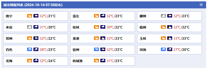 南寧市:今天白天到晚上,多云轉(zhuǎn)陣雨或雷雨、局部中雨,南轉(zhuǎn)北風2~3級,最高氣溫33℃,最低氣溫22℃。