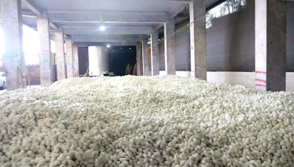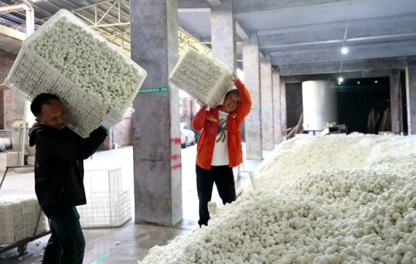 一筐筐雪白的蠶繭源源不斷地送往附近的繭站銷售。一大早,嘉樂(lè)鎮(zhèn)蠶繭站門前就已人聲鼎沸、熱鬧非凡,滿載蠶繭的農(nóng)用車排起了長(zhǎng)龍,蠶農(nóng)們有說(shuō)有笑地討論著這一季的收成。站內(nèi),工作人員忙碌著對(duì)鮮繭進(jìn)行評(píng)級(jí)、定價(jià)、稱重、結(jié)算,現(xiàn)場(chǎng)一派忙碌,收購(gòu)來(lái)的蠶繭堆積成了一座座“小山”。