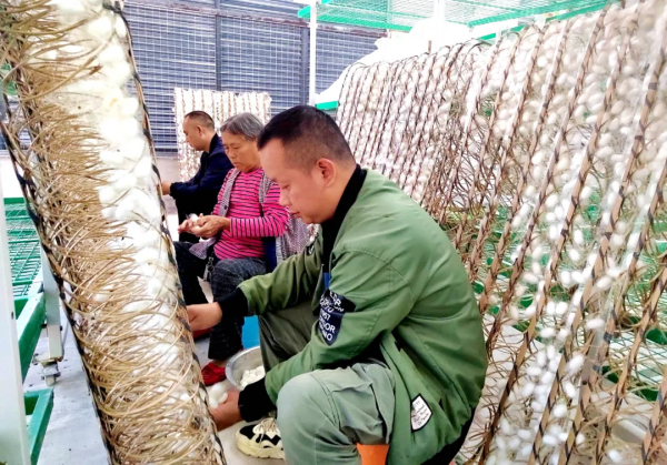 “這一季晚秋蠶總共喂了5張,經(jīng)過(guò)一個(gè)多月的精心喂養(yǎng),結(jié)出的蠶繭顏色好、個(gè)頭也大,產(chǎn)量在200公斤左右,又是一個(gè)豐收季。”王付章告訴記者,他使用的大蠶養(yǎng)殖工廠,不僅有良好的通風(fēng)條件,還配套有切桑機(jī)、軌道式升降省力化蠶臺(tái)、自動(dòng)旋轉(zhuǎn)方格蔟和自動(dòng)采繭機(jī)等先進(jìn)機(jī)具設(shè)備,養(yǎng)蠶更加科學(xué)高效。今年的蠶繭價(jià)格較為喜人,加上有“小蠶共育技術(shù)”支撐,養(yǎng)蠶效益大大提升?!敖衲?個(gè)批次總共養(yǎng)了30多張蠶,總收入超過(guò)了10萬(wàn)元?!笨粗矍鞍谆ɑǖ男Q繭,王付章喜上眉梢。