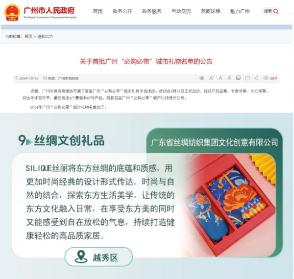 10月15日,由廣州市商務(wù)局組織,并邀請(qǐng)主管部門、行業(yè)專家、媒體代表等組成“必購(gòu)必帶”評(píng)審委員會(huì)評(píng)選,并結(jié)合大眾選票的首批廣州“必購(gòu)必帶”城市禮物名單公布。廣東省絲綢紡織集團(tuán)(以下簡(jiǎn)稱絲紡集團(tuán))所屬企業(yè)廣東省絲綢紡織集團(tuán)文化創(chuàng)意有限公司的嶺南花卉系列絲巾文創(chuàng)禮盒入選“時(shí)尚潮品”品類。