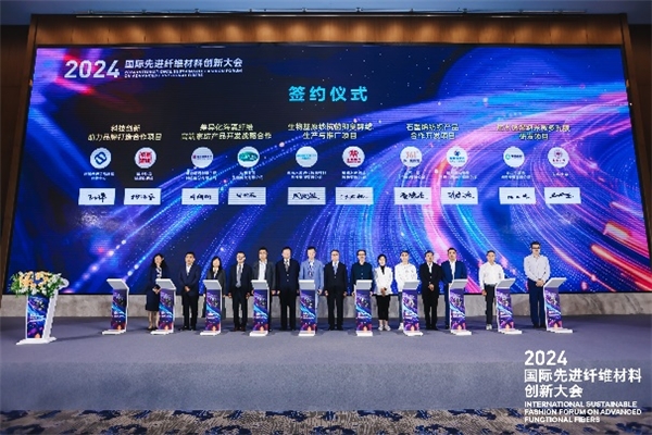 本次會(huì)上舉行了科技創(chuàng)新助力品牌打造合作項(xiàng)目、生物基原紗抗菌抑臭錦綸生產(chǎn)與推廣項(xiàng)目、差異化海藻纖維高端家紡產(chǎn)品開(kāi)發(fā)戰(zhàn)略合作、石墨烯紡織產(chǎn)品合作開(kāi)發(fā)項(xiàng)目、防水透濕納米微多孔膜研發(fā)項(xiàng)目、凝聚創(chuàng)新資源形成新質(zhì)生產(chǎn)力合作項(xiàng)目、超高TiO2含量PET短纖的開(kāi)發(fā)與應(yīng)用研究項(xiàng)目、差異化功能與智能性針織面料與服裝開(kāi)發(fā)項(xiàng)目、NAO虛擬織布機(jī)×Sustens?生物基彈力短纖開(kāi)發(fā)合作項(xiàng)目、古法面料工藝傳承與時(shí)尚創(chuàng)新項(xiàng)目、三川×Sustens?生物基彈力短纖合作項(xiàng)目、元氧能量助眠安睡服開(kāi)發(fā)項(xiàng)目、呋喃基聚酯PEF短纖的研發(fā)及產(chǎn)業(yè)化項(xiàng)目共13個(gè)重點(diǎn)項(xiàng)目的簽約儀式。