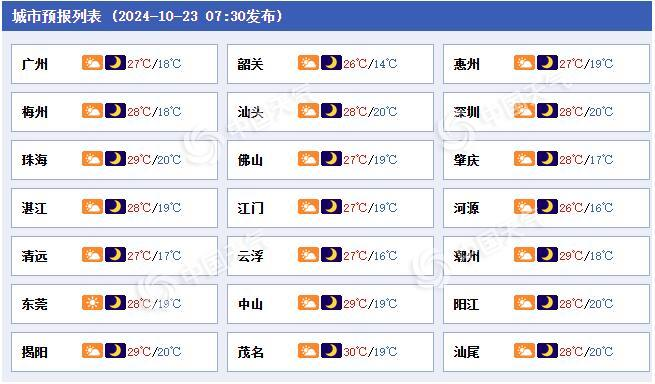 受冷空氣影響,廣東各地氣溫還將略有下降,晝夜溫差大,早晚清涼。廣東省氣象臺預計,今天廣東全省晴間多云。明天,廣東全省晴到少云,粵北、肇慶和云浮市縣最低氣溫14至17℃,南部沿海市縣20至23℃,其余市縣17至20℃。