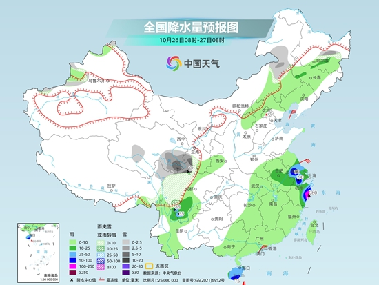 明天,新疆南部、西藏北部和東部、青海大部、川西高原、甘肅西南部、內(nèi)蒙古中東部等地部分地區(qū)有小到中雪或雨夾雪,其中,青海東部局地有大雪。四川南部、內(nèi)蒙古中東部、福建東北部、浙江北部和東部、上海、江蘇南部、安徽東南部、臺(tái)灣島東部等地部分地區(qū)有中到大雨,其中,浙江東部、福建東北部、臺(tái)灣島東部等地部分地區(qū)有暴雨或大暴雨。