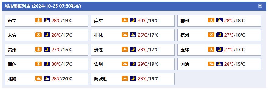 今天白天,全區(qū)多云到晴。各地氣溫:高寒山區(qū)8~26℃,桂北10~29℃,桂南15~31℃。