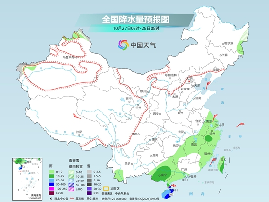 具體來看,今天新疆阿勒泰山區(qū)和南疆南部山區(qū)、內(nèi)蒙古中部、西藏東北部、青海東部和南部、甘肅祁連山山區(qū)、川西高原北部等地部分地區(qū)有小到中雪或雨夾雪,其中,內(nèi)蒙古中部、青海東南部等地局部地區(qū)有大雪。內(nèi)蒙古中部、西藏東南部、四川西南部、江蘇東南部、上海、浙江東部、福建東北部、臺灣島東部、西沙群島、中沙群島等地部分地區(qū)有中到大雨,其中,浙江沿海地區(qū)、福建東北部、臺灣島東部、西沙群島、中沙群島等地部分地區(qū)有暴雨或大暴雨,局地特大暴雨。