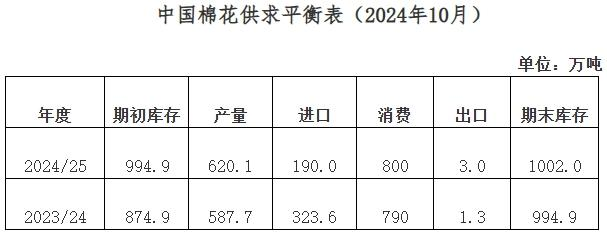中國棉花協(xié)會10月預(yù)測:2024/25年度全國棉花產(chǎn)量620.1萬噸,較上期上調(diào)16.5萬噸,同比增長5.5%;棉花進口量190萬噸,同比下降41.3%;消費量800萬噸,同比增長1.3%;期末庫存1002萬噸,同比增長0.7%。