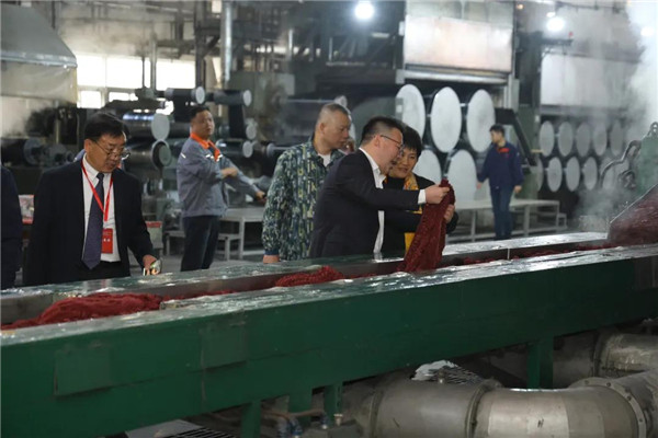 與會代表對滁州興邦聚合彩纖有限公司聚酯和纖維生產(chǎn)流程與環(huán)節(jié),以及滁州霞客無染彩色紡有限公司色紡紗線生產(chǎn)各工序進行了參觀,與會代表們對在線添加原液著色生產(chǎn)有色纖維,進而紡出有色紗線產(chǎn)生了濃厚的興趣。