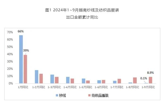 2024年以來(lái),越南紡織品服裝出口延續(xù)2023年下半年以來(lái)的良好勢(shì)頭,實(shí)現(xiàn)穩(wěn)步增長(zhǎng)。1月出口額同比增幅高達(dá)39%,為2024年上半年最高增速,到6月累計(jì)出口增速放緩至4.6%。進(jìn)入三季度,增速開(kāi)始緩慢回升。從主要市場(chǎng)看,今年1~9月越南對(duì)美國(guó)、日本和中國(guó)出口的紡織品服裝金額實(shí)現(xiàn)增長(zhǎng)。其中,越南對(duì)美國(guó)出口120.1億美元,同比增加9.1%;對(duì)日本和中國(guó)分別出口31.3億美元和9.8億美元,分別同比增長(zhǎng)6.4%和18.3%。同期,越南對(duì)韓國(guó)出口紡織品服裝同比下降1.9%至23.8億美元。