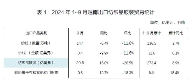 根據(jù)越南海關(guān)統(tǒng)計(jì)數(shù)據(jù)顯示,今年1至9月越南紡織品服裝(不含紗線)出口額273.4億美元,同比增長(zhǎng)8.9%;出口紗線32.6億美元,與去年同期基本持平。9月當(dāng)月,越南出口紡織品服裝29.8億美元,同比增長(zhǎng)16.0%;出口紗線3.4億美元,同比減少9.9%。