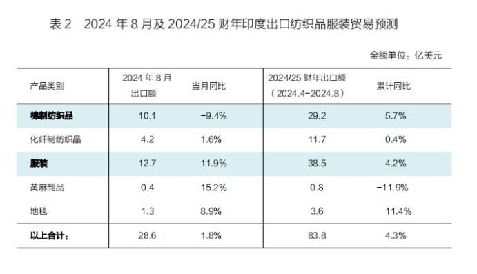 印度商業(yè)工業(yè)部公布的2024年8月出口預(yù)估數(shù)據(jù)顯示,今年8月,印度向全球出口棉制紡織品10.1億美元,同比減少9.4%;出口服裝12.7億美元,同比增加11.9%。加上化纖制紡織品、黃麻制品以及地毯等產(chǎn)品,印度以上紡織品服裝8月出口額共計(jì)28.6億美元,同比增加1.8%。