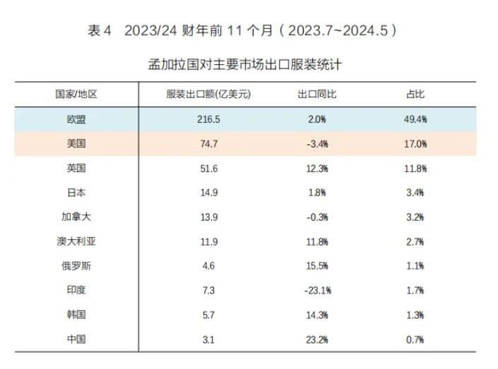 從主要市場(chǎng)看,2023/24財(cái)年前11個(gè)月孟加拉國(guó)對(duì)歐盟、英國(guó)和澳大利亞等發(fā)達(dá)經(jīng)濟(jì)體市場(chǎng)出口實(shí)現(xiàn)較快增長(zhǎng)。其中,孟加拉國(guó)對(duì)歐盟出口服裝216.5億美元,同比增長(zhǎng)2%,占對(duì)全球出口比重的49.4%;對(duì)英國(guó)出口服裝51.6億美元,同比上升12.3%,占比11.8%。同期孟加拉國(guó)對(duì)美國(guó)出口服裝74.7億美元,同比減少3.4%,占其服裝出口總額的17%;對(duì)中國(guó)出口服裝3.1億美元,同比增長(zhǎng)23.2%,占比0.7%。