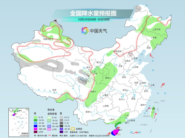 中央氣象臺(tái)預(yù)計(jì),今天,內(nèi)蒙古東北部、黑龍江西北部、新疆北疆北部和南疆西部山區(qū)、西藏北部、青海西北部和東部、甘肅西南部、川西高原北部等地部分地區(qū)有小雪或雨夾雪,其中,新疆北疆北部、青海東南部等地局地有中到大雪。雷州半島、海南島等地部分地區(qū)有大到暴雨,其中,海南島部分地區(qū)有大暴雨或特大暴雨。
