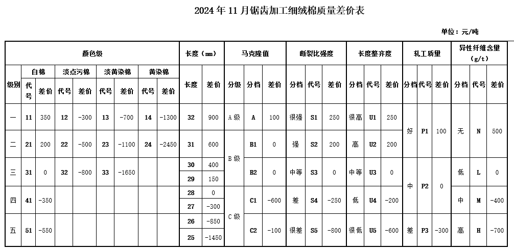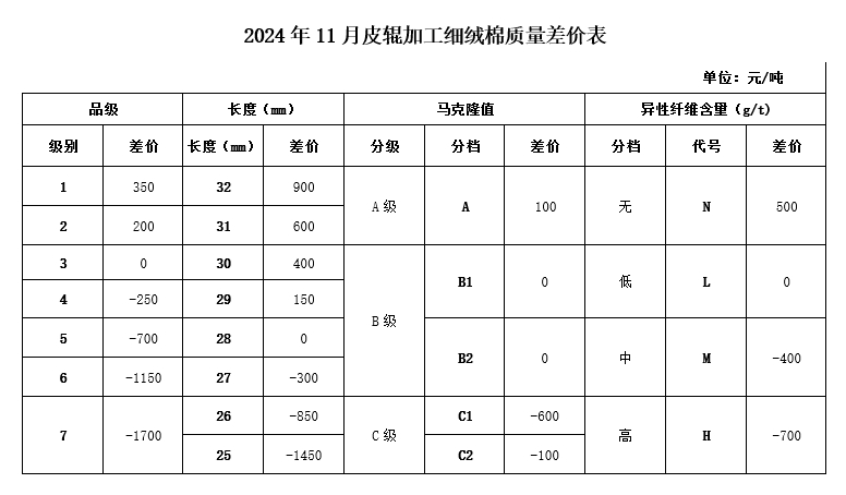 根據(jù)《中國棉花協(xié)會國產(chǎn)棉質(zhì)量差價表管理辦法》規(guī)定,現(xiàn)正式發(fā)布2024年11月《鋸齒加工細(xì)絨棉質(zhì)量差價表》、《皮輥加工細(xì)絨棉質(zhì)量差價表》和《長絨棉質(zhì)量差價表》(單位:元/噸)。